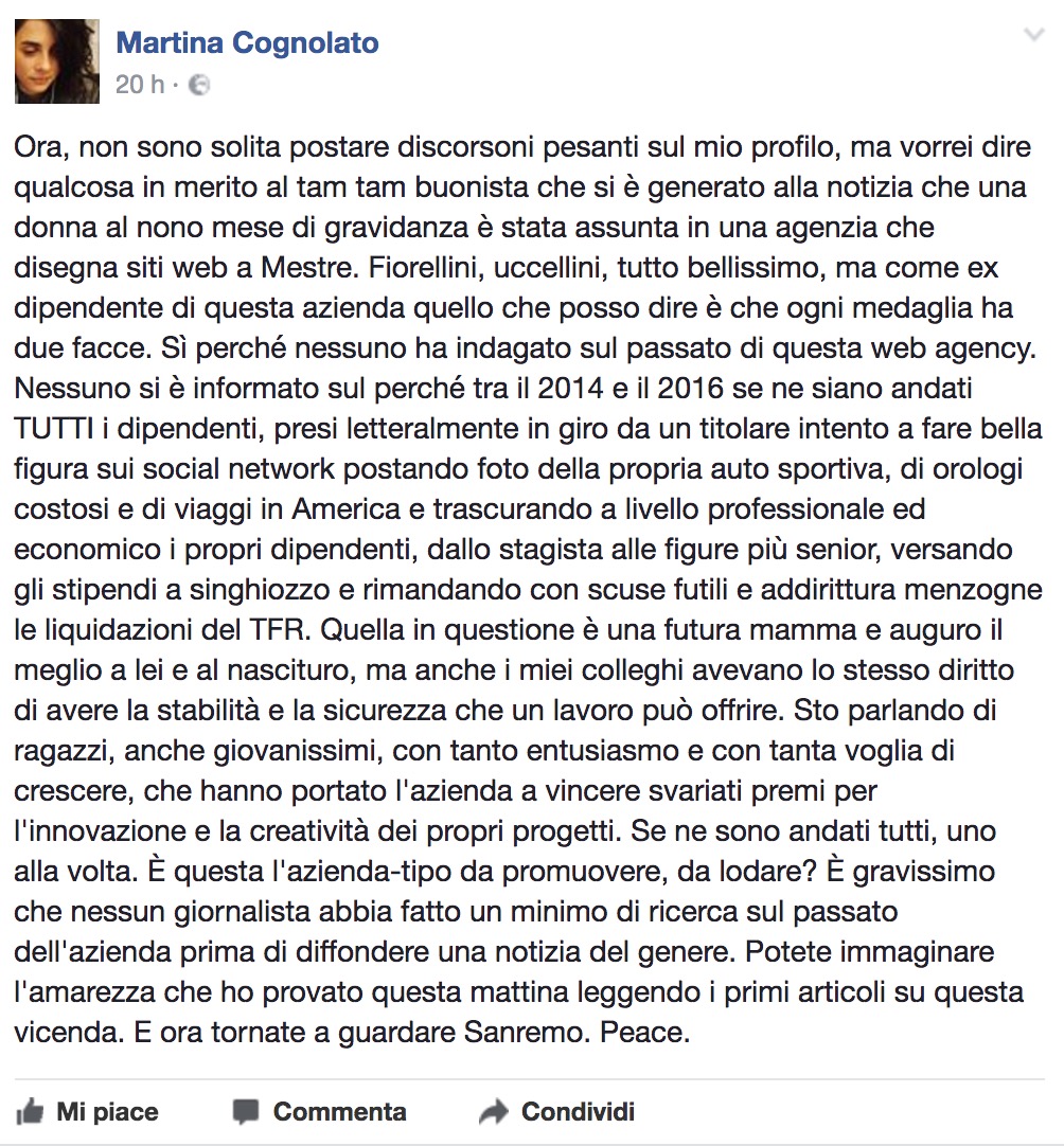 Questa, almeno, è la versione di un’altra Martina, Martina Cognolato, una giovane grafica ed esperta di comunicazione, ex dipendente della Creative Way, che alla notizia dell’assunzione ha scritto in un lungo post su Facebook: