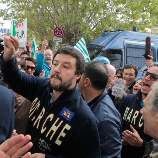 Lunedì mattina Salvini era stato contestato ad Ancona: lancio di uova e pomodori da parte di alcuni manifestanti che scandivano slogan tipo “via, fascista”. FOTO ASNA.