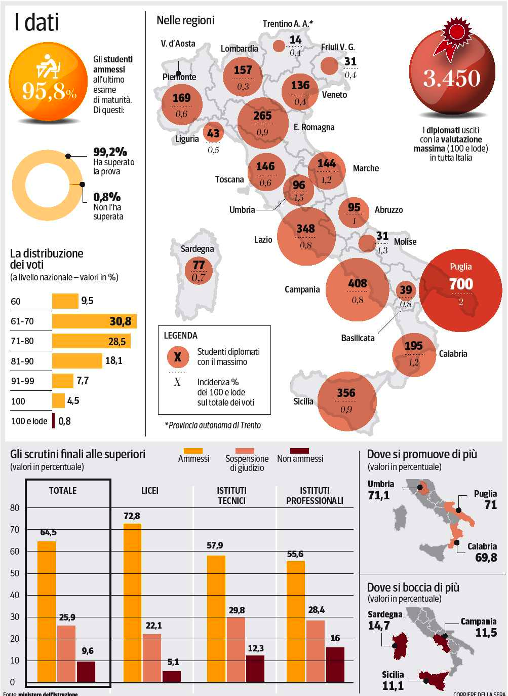 “Se nel 2011/2012 erano 2.581 e nel 2012/2013 2.949, quest’anno hanno sfondato quota tremila, toccando 3.450. Quasi uno su cento. Di questi più del 20 per cento (700 diplomati) ha studiato in Puglia. Altri 408 in Campania. Quindi in Sicilia (356) e Lazio (348). Soltanto 14 i cento e lode nella Provincia autonoma di Trento. Mentre il Molise, in un anno, di fatto raddoppia i super-bravi che passano dallo 0,7 all’1,3 per cento. La Calabria è la regione con la percentuale (7,3) più elevata di 100. Seguono Puglia (6,6%) e Umbria (6,1)”.