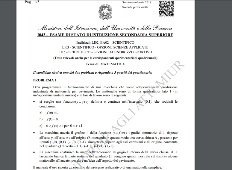 ROMA – La traccia del primo problema per il liceo Scientifico, dove la seconda prova dell’esame di Maturità 2018 è di Matematica, riguarda il funzionamento di una macchina adoperata nella produzione industriale di mattonelle per pavimenti. [App di Blitzquotidiano, gratis, clicca qui,- Ladyblitz clicca qui –Cronaca Oggi, App on Google Play] Il secondo problema è più tradizionale, si tratta dello “studio di una funzione”.