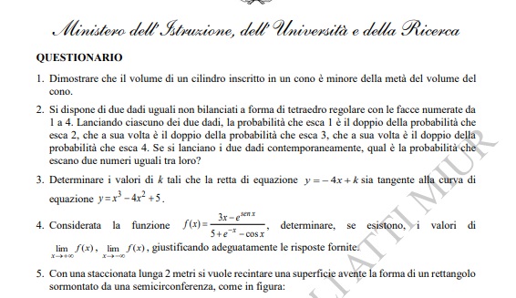 Nel questionario dello Scientifico tra le richieste ci sono: dimostrare che il volume di un cilindro iscritto in un cono è minore della metà del volume del cono, un problema sui dadi e il calcolo della grandezza di staccionata.