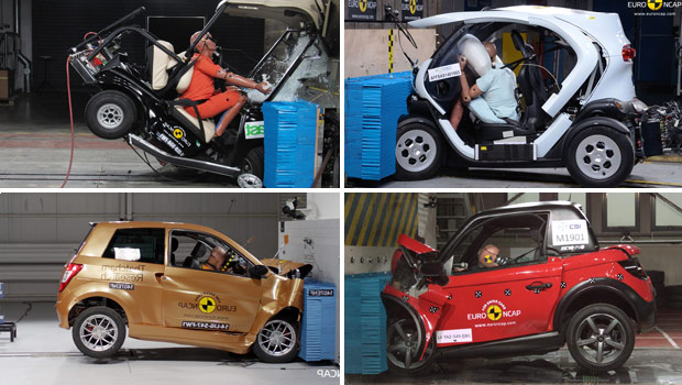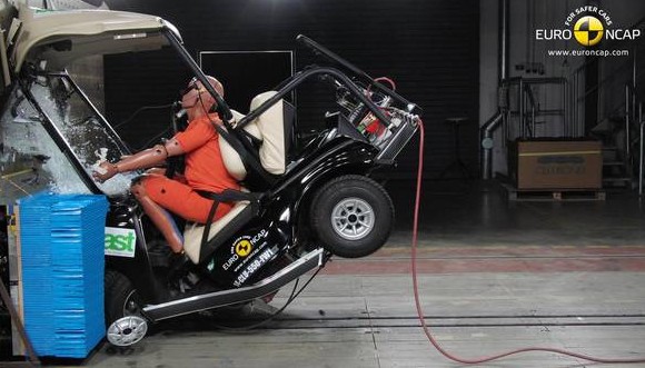 “i manichini hanno riportato lesioni compatibili con ciò che sarebbe accaduto sulle persone su ginocchia, femori, torace, addome, bacino, collo e testa. L’esame ha peraltro preso in considerazione veicoli diversi, per linee e prestazioni: la macchinetta da golf Club Car Villager, omologata però per la circolazione stradale se dotata di fanali e cinture di sicurezza, la Ligier Ixo a quattro posti, motore diesel, la Renault Twizy 80 elettrica (airbag e cinture a quattro punti nell’equipaggiamento di serie) e la Tazzari Zero, anch’esso elettrico ma capace di toccare i 100 all’ora. Ebbene su 16 punti disponibili per passare il test di sicurezza, Euro Ncap ne ha assegnati solo 6 alla Twizy, 4 alla Tazzari e due alle altre. Dall’Aci confermano: «Ligier e Tazzari sono stati i meno performanti nell’impatto frontale: per la rottura della copertura sopra il guidatore o del sedile il conducente sarebbe esposto a gravi rischi. La struttura della Club Car si è praticamente distrutta nel test dell’impatto frontale. Renault Twizy offre una protezione migliore, ma la struttura rigida e il comportamento del sistema di ritenuta ne compromettono fortemente la sicurezza». Sempre secondo l’Automobile Club, in Italia, fra il 2010 e il 2012 ci sono stati 40 morti e 2.152 feriti sulle microcar. Il 40 per cento dei conducenti feriti era minorenne”.
