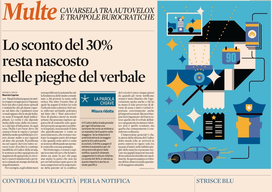 “è ormai a regime lo sconto del 30% che fu introdotto un anno fa per chi paga una multa (a patto che non sia per un’infrazione tanto grave da non comportare né la sospensione della patente né la confisca del veicolo) entro cinque giorni da quando gli viene notificata: ormai è stato chiarito che l’agevolazione spetta anche a chi ha in mano il solo preavviso di divieto di sosta e tutti i verbali riportano correttamente anche gli importi scontati. Ma non bisogna farsi ingannare dal burocratese: quello che il verbale definisce «pagamento in misura ridotta» non è quello scontato, ma quello che comunemente è considerato ordinario”.