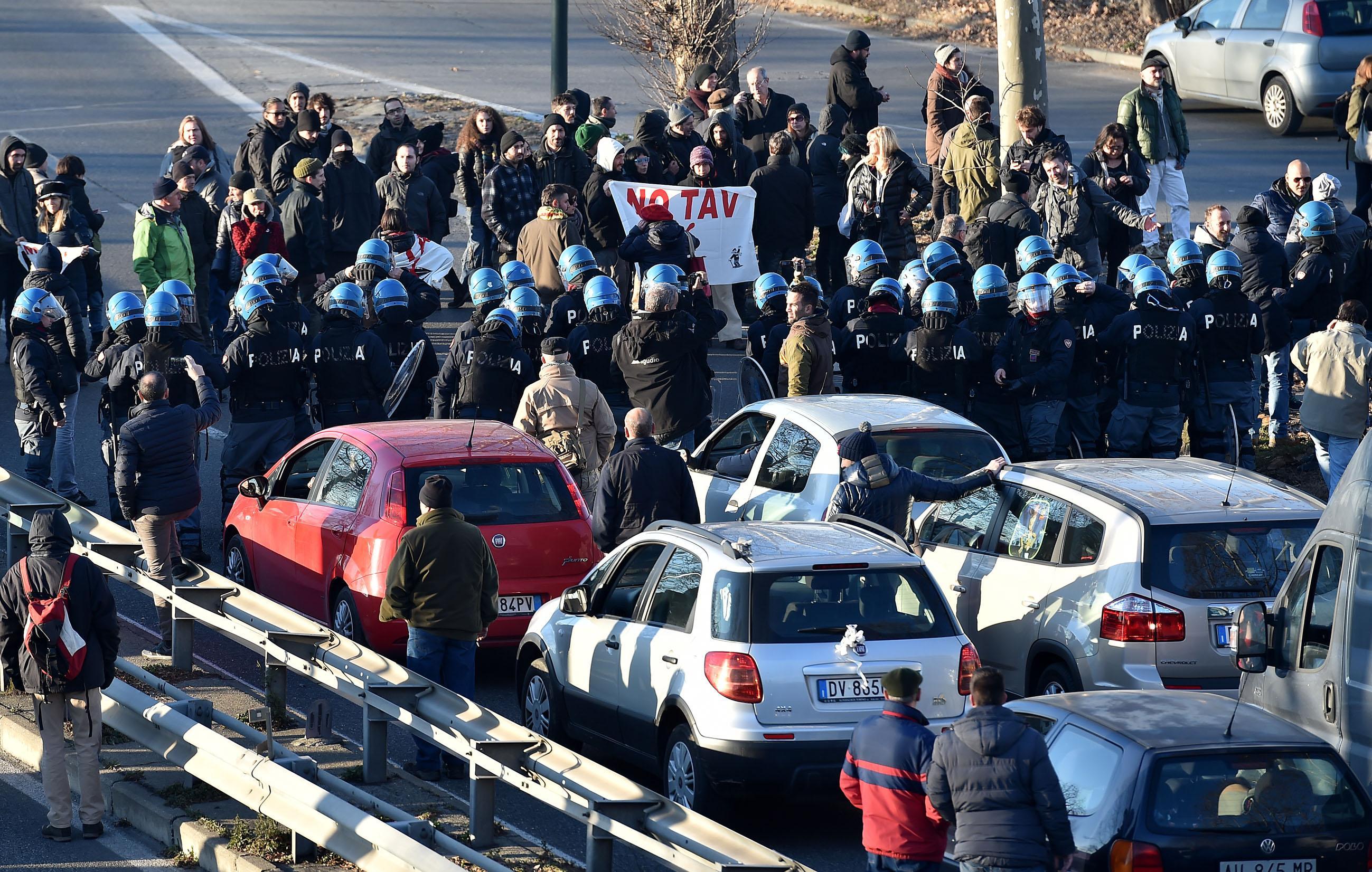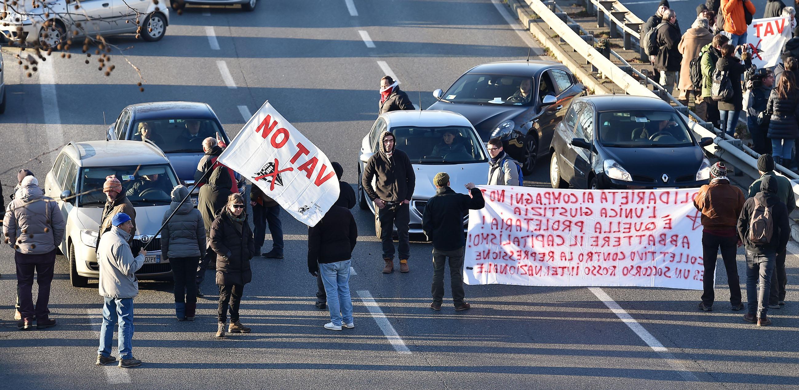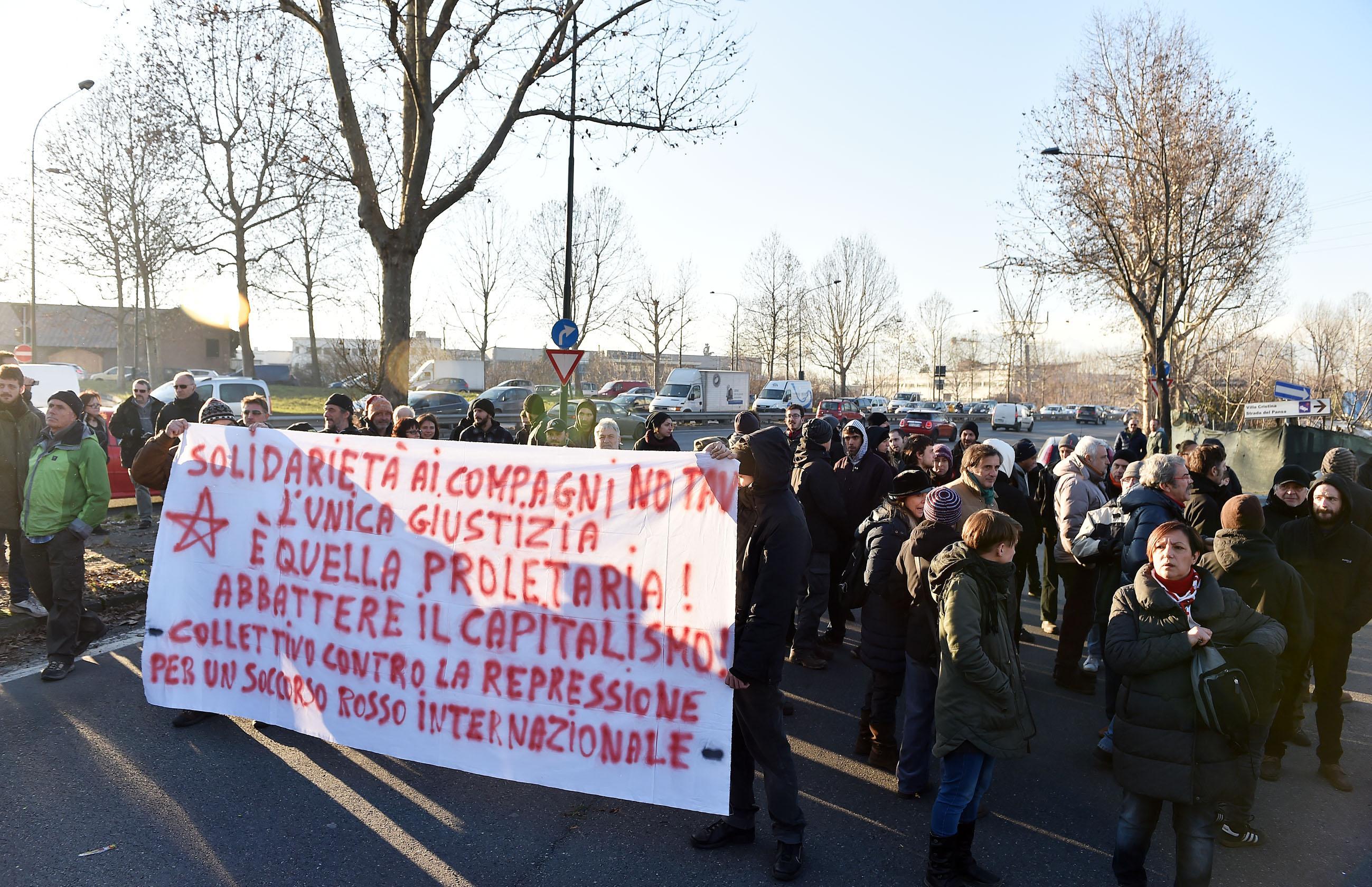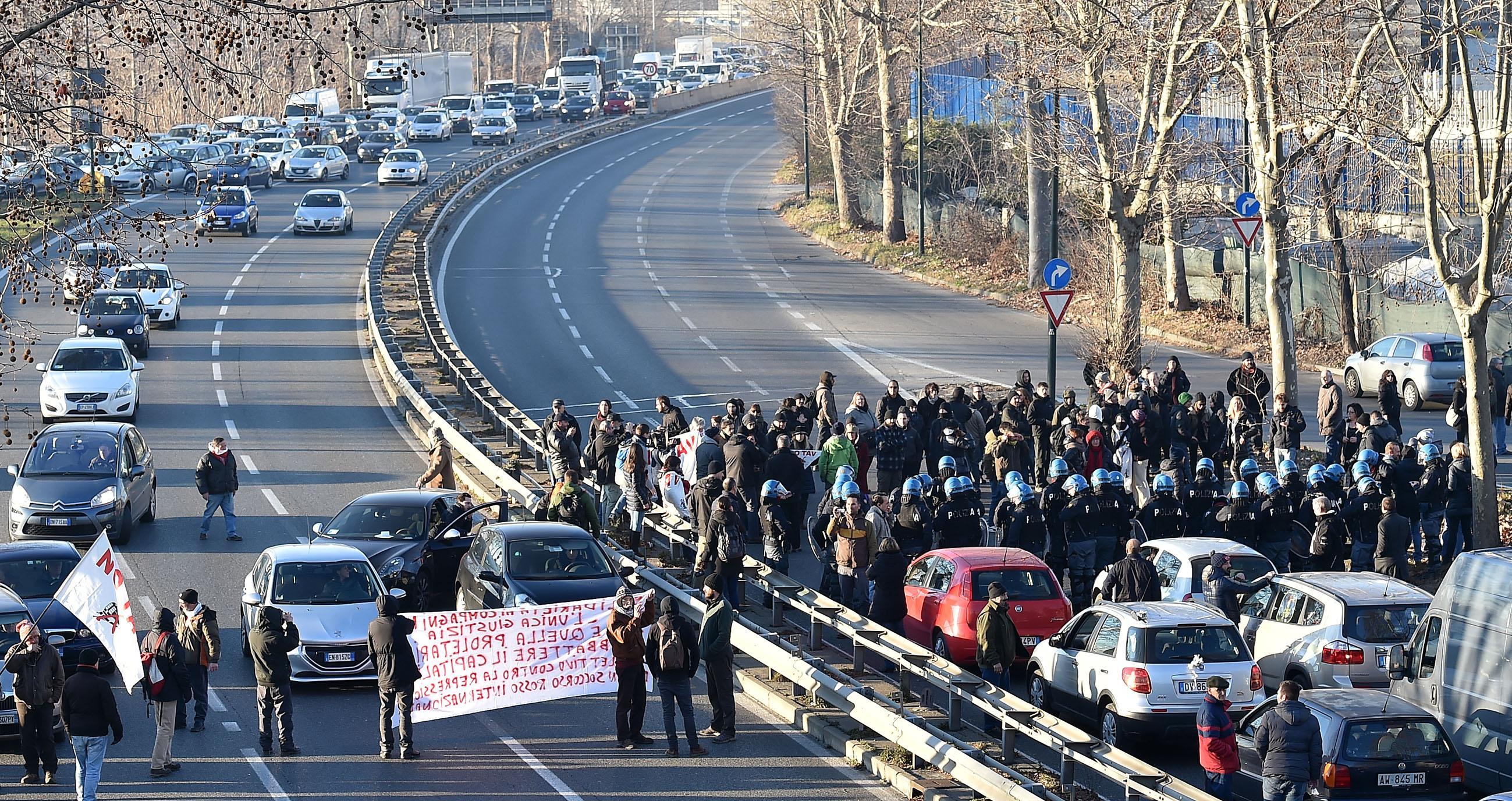 “Non sono state condannate le opinioni, ma le manifestazioni di dissenso che hanno travalicato i confini del lecito”, ha detto invece l’avvocato Anna Ronfani, parte civile per Ltf, la societร che si occupa della Torino -Lione. “Lo dimostra lo stesso dispositivo dei giudici, lungo e articolato. Per leggerlo ci รจ voluta un’ora. Significa che le singole posizioni degli imputati sono state vagliate con estrema cura e, evidentemente, con grande sforzo in camera di consiglio”. Un gruppo di attivisti no tav hanno improvvisato un blocco stradale a Torino sulla via che, costeggiando l’aula bunker delle Vallette, si immette sulla tangenziale. Si tratta di una dimostrazione di protesta contro la sentenza del maxiprocesso (foto Ansa).