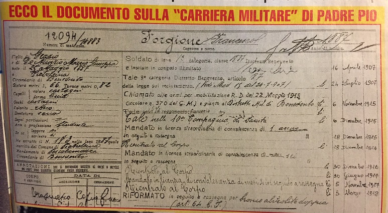 ROMA – Padre Pio fece il militare. Il settimanale “Giallo” pubblica in esclusiva di documento del suo arruolamento: “Francesco Forgione (il nome di battesimo del Santo) servì la Patria con fedeltà e onore”. Per questo il Vaticano potrebbe nominarlo patrono dei militari invalidi.