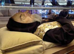 Il punto sensibile, e per certi versi decisivo, è che si tratta di una reliquia evoluta, tecnologica, siliconata, appunto. Lo stesso corpo del santo è conservato dentro la teca nella sua relativa integrità grazie a complessi ritrovati della chimica inorganica: materassini in plexiglass, contenitori in Pvc di gel silicei per l’umidità, insufflaggio d’azoto contro le reazioni ossidative. Come dire che il sacro, e la devozione che in esso si rispecchia e si riconosce, sono venuti a patti con la materia artificiale; e che i santi rimangono tali anche nel tempo della loro riproducibilità post-umana.