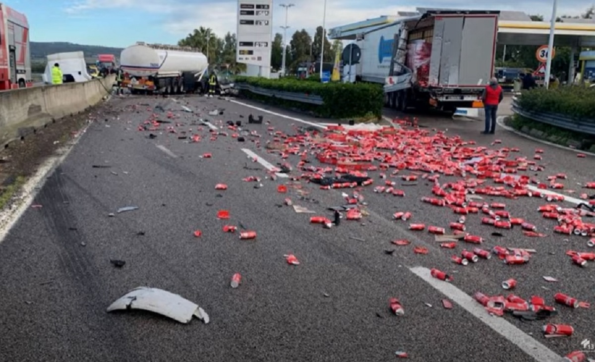 Palagiano (Taranto): centinaia di Coca-Cola in lattina sulla Statale 106. Per fortuna il danno maggiore, e spettacolare, è stata l’improvvisa marea di lattine di Coca-Cola a invadere la carreggiata. Poteva finire molto peggio lo scontro fra Tir occorso questa mattina sulla Statale Jonica 106. All’altezza di Palagiano, in provincia di Taranto.