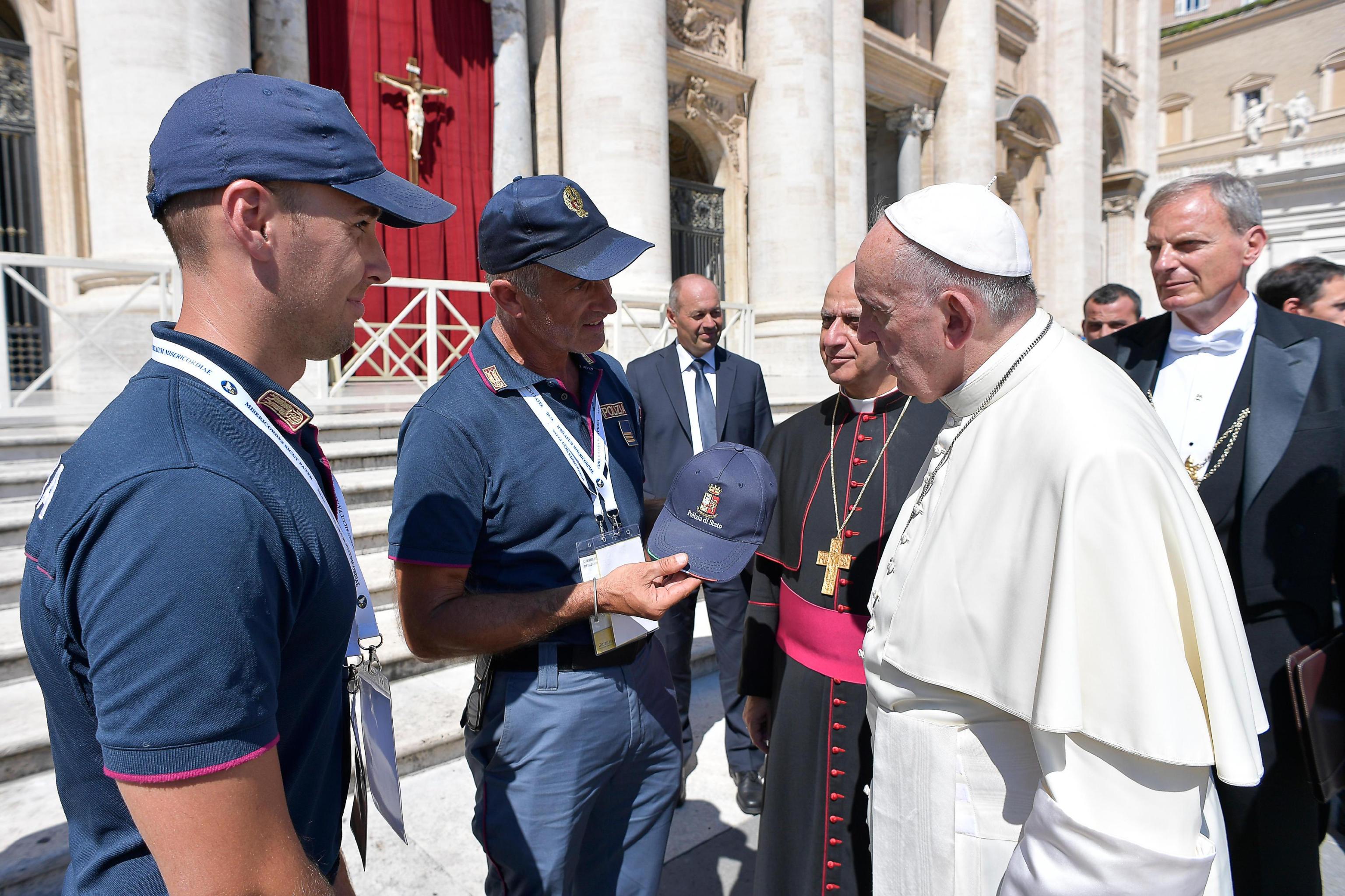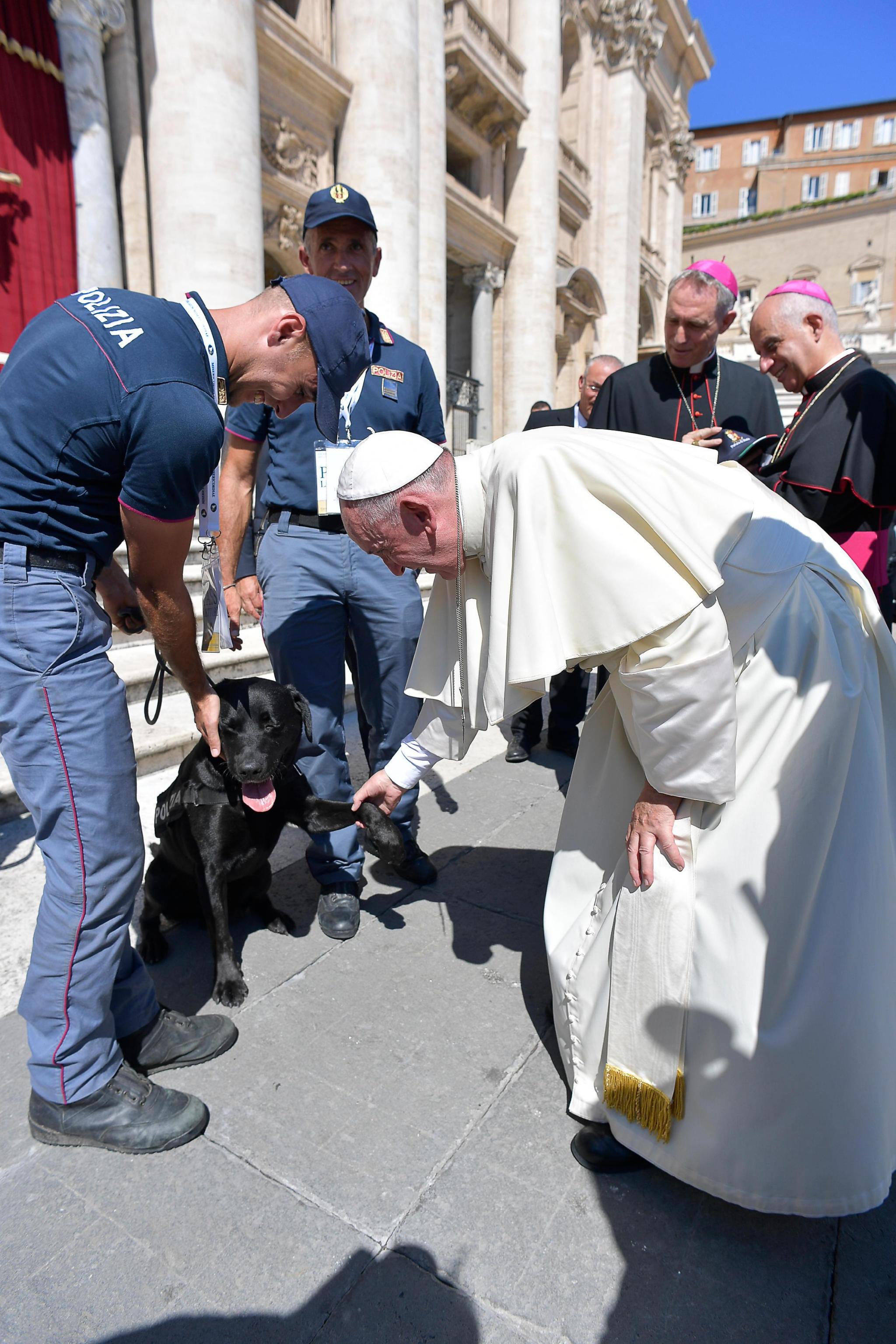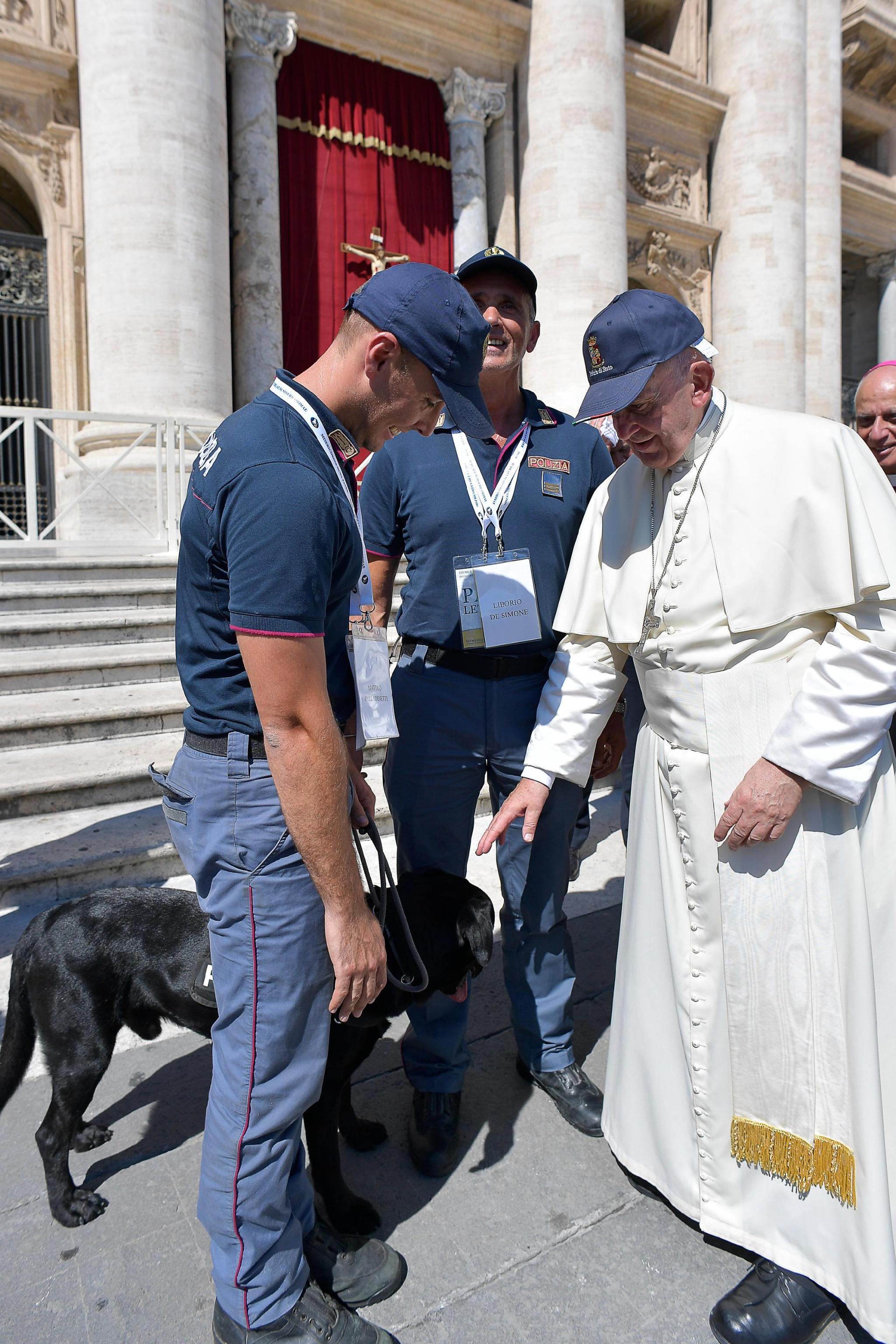 ROMA – Ad aspettare Papa Francesco sul sagrato di piazza San Pietro insieme ai volontari che partecipano al giubileo del volontariato c’era anche Leo, il labrador della Polizia di Stato che dopo il sisma ha salvato dalle macerie Giorgia la bimba rimasta sotto la sua casa crollata per oltre 16 ore. Il Papa si è avvicinato al conduttore del cane l’assistente della Polizia Matteo Palladinetti, e al responsabile della Squadra Cinofili della Questura pescarese, il sovrintendente capo Liborio Desimone e ha accarezzato Leo. Poi la delegazione dei soccorritori ha donato al Papa un berretto con lo stemma della Polizia che Francesco ha indossato.