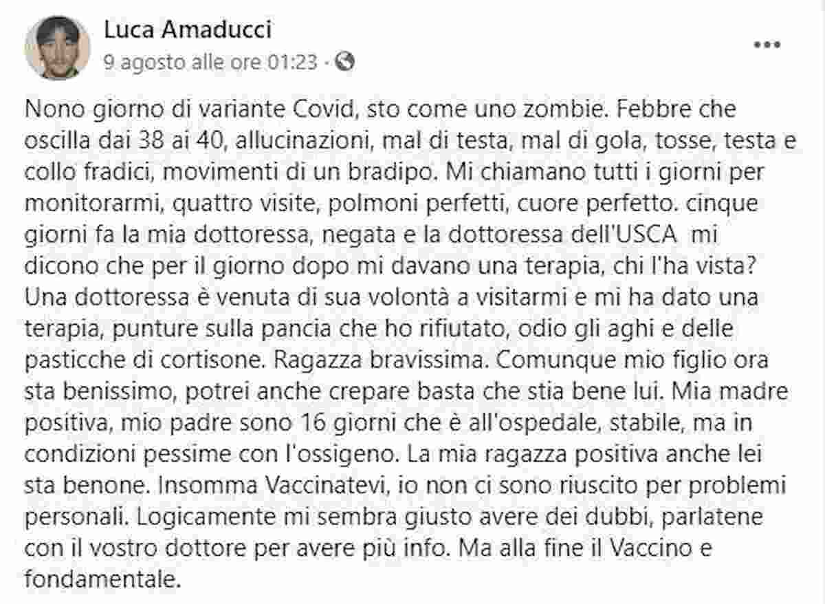 Luca Amaducci, l'appello a vaccinarsi scritto su Facebook