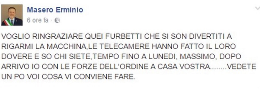 PIOVENE ROCCHETTE (VICENZA) – Rigano alcune auto parcheggiate nel centro di Piovene Rocchette, in provincia di Vicenza. E tra quelle auto c’è anche quella del sindaco, Erminio Masero, che su Facebook li avverte: “Le telecamere hanno fatto il loro dovere. So chi siete. Tempo fino a lunedì al massimo e dopo arrivo con le forze dell’ordine a casa vostra”.