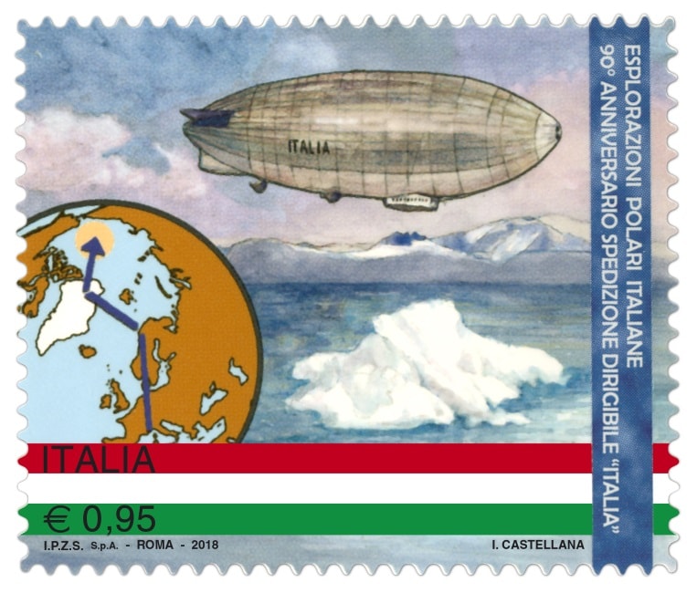 Un francobollo celebrativo delle esplorazioni polari italiane, nel 90° anniversario della spedizione del dirigibile “Italia” al Polo Nord, avvenuta nel 1928, del valore di € 0,95 è stato emesso oggi dal Ministero dello Sviluppo Economico. Allo stand di Poste Italiane , alla presenza della pronipote del comandante della spedizione Umberto Nobile è stato presentato l’annullo speciale realizzato per l’occasione.