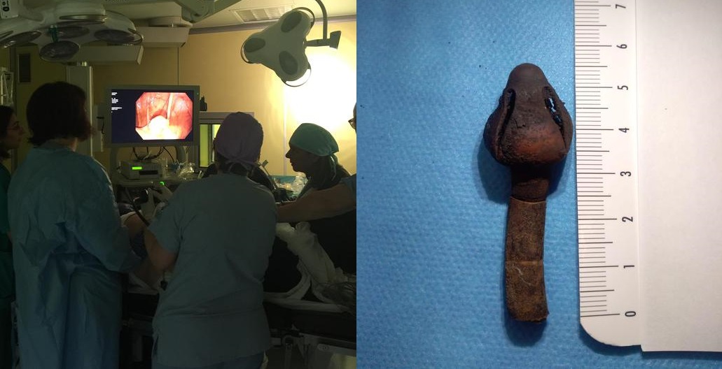 I medici non hanno potuto rimuoverlo per via orale (la paziente aveva avuto una tracheostomia con restringimento della parte alta della faringe) e pertanto il direttore della struttura complessa interaziendale di Gastroenterologia ed endoscopia digestiva, Angelo Sigillito, e il chirurgo Giuseppe Tramutola, hanno deciso di effettuare una doppia procedura endoscopico-chirurgia.