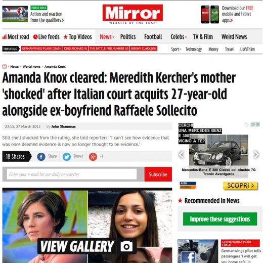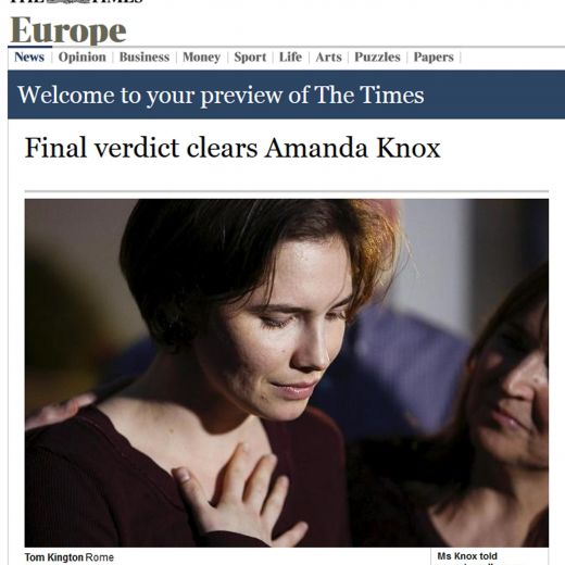 La famiglia di Meredith. “A me dispiace che la famiglia di Meredith sia delusa dalla sentenza. Questa sentenza è la verità processuale che stavolta è coincidente con i fatti. Io non ho nulla a che fare con il delitto. Meredith la conoscevo pochissimo, non avevo motivi per avere astio e rendermi partecipe di un delitto orribile. Spero che loro riconoscano questa verità dei fatti. Guede non lo conosco affatto. Amanda l’ho sentita ultimissimamente, le ho fatto gli auguri, siamo entrambi molto felici. Ha festeggiato con la sua famiglia”.