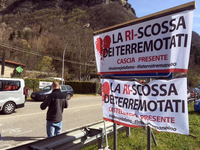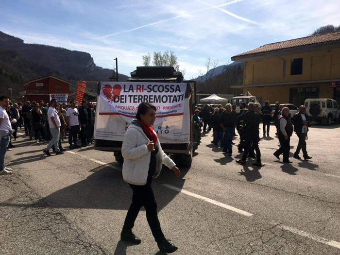 Intanto la protesta è iniziata la mattina del 1° aprile in contemporanea ad Arquata del Tronto, dove la Salaria è stata bloccata dai trattori e da tavoli e sedie portati dai manifestanti. Sono circa 200, ma la gente continua ad arrivare e oltre ai terremotati del luogo, si riuniscono al blocco anche quelli delle delegazioni di Castelluccio, Cascia, Samugheo.