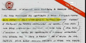 “Ricordo che nel bagno in un secchio c’erano degli stracci da pavimento e da spolvero bagnati. Nel frattempo, iniziavo a stendere dei panni fuori dalla finestra ed in tale occasione ho sentito un rumore di abrasione sul pavimento del cortile, quindi affacciandomi ho notato Antonio che, stando inginocchiato a terra, stava grattando con insistenza il pavimento, con qualcosa che non sono riuscita a vedere, ma sicuramente di metallo. Il gesto che lui faceva, era quello di una persona che vuole cancellare qualcosa e ciò mi è sembrato particolarmente strano. Mentre Antonio effettuava la predetta operazione, aveva al suo fianco una busta in nylon di colore giallo ocra, del tipo della spesa. Tale busta mi sembra fosse riempita fino alla metà ed ho avuto l’impressione contenesse qualcosa di simile a panni bagna-ti e comunque pesanti”.