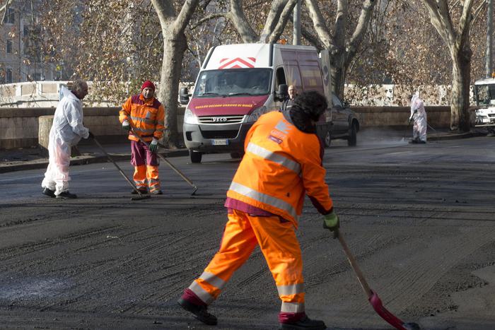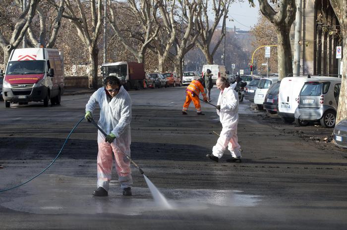 A seguire, operatori dell’Ama a lavoro lo scorso 24 dicembre, per ripulire un tratto di Lungotevere (foto Ansa).
