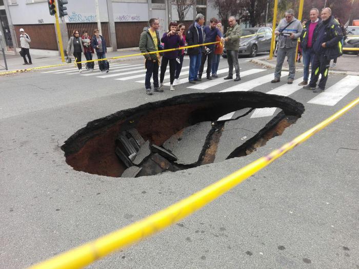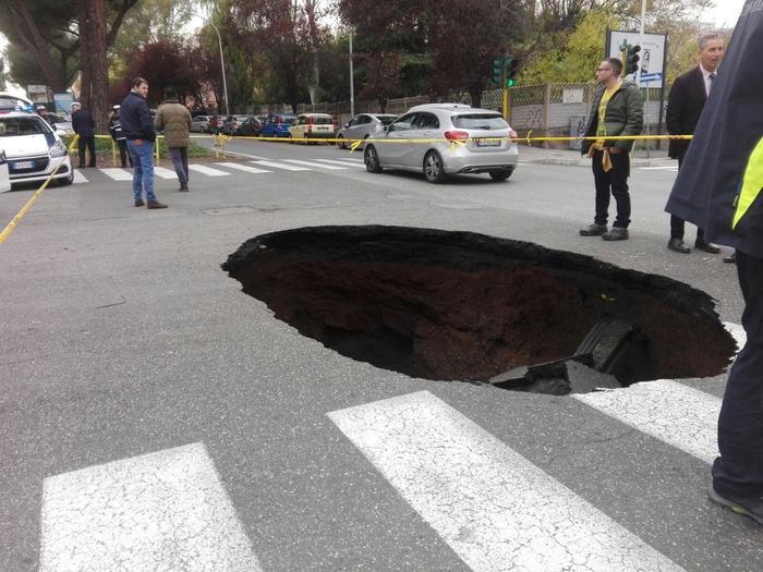 Sotto terra si nota la colonna di scarico di un pozzetto fognario costruita in mattoni, che giunge fino a dodici metri di profondità. Ancora da chiarire le cause dello smottamento. I tecnici presenti sul posto non escludono, a una prima e sommaria analisi, infiltrazioni di acqua. Entro sera gli operai dovrebbero ricoprire l’ampia buca e riportare in sicurezza l’area che dovrebbe poi essere riaperta al traffico.