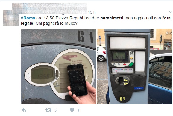 ROMA – Brutto risveglio lunedì 27 marzo per chi vive a Roma e ha avuto bisogno di parcheggiare. L’arrivo dell’ora legale ha mandato in tilt i parchimetri, tanto che la scelta era tra pagare almeno 1 euro in più per la sosta nelle strisce blu o rinunciare, con le macchinette fuori servizio nella zona, e ritrovarsi una multa sul parabrezza ad aspettarli. La protesta arriva così su Twitter, con foto a dimostrazione dei parchimetri impazziti e richiesta di spiegazioni all’Atac, agenzia per la mobilità romana, che si è limitata ad informare gli utenti: “Siamo a lavoro per aggiornarli”.