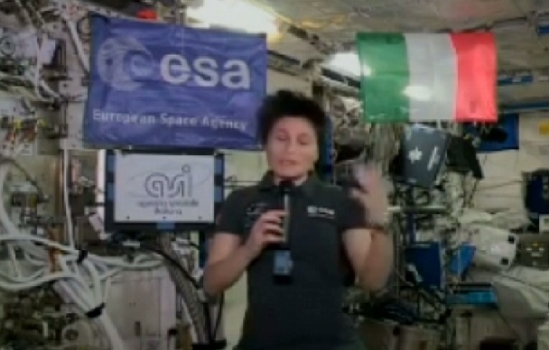 Samantha Cristoforetti, capelli rizzati e microfono che fluttua nell’aria