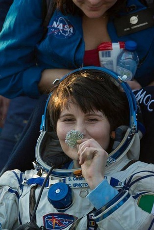 Samantha Cristoforetti odora un fiore (foto Esa)