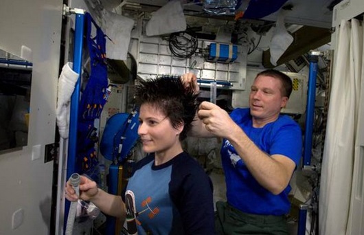 Samantha si dedica alla pulizia del bagno. Su twitter commenta così lo scatto: “La ISS è la nostra casa…avere un bagno che funziona è importante!”