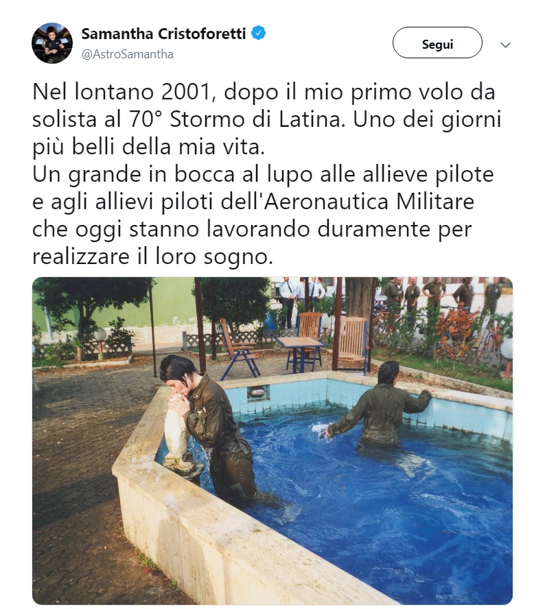 Nel post pubblicato da Astrosamantha si legge: “Nel lontano 2001, dopo il mio primo volo da solista al 70° Stormo di Latina. Uno dei giorni più belli della mia vita. Un grande in bocca al lupo alle allieve pilote e agli allievi piloti dell’Aeronautica Militare che oggi stanno lavorando duramente per realizzare il loro sogno”.