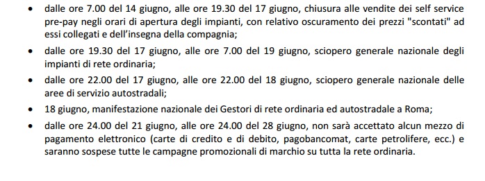 – dalle ore 24 del 21 giugno alle ore 24 del 28 giugno, non sarà accettato alcun mezzo di pagamento elettronico (carte di credito e di debito, pagobancomat, carte petrolifere, ecc.) e saranno sospese tutte le campagne promozionali di marchio su tutta la rete ordinaria.