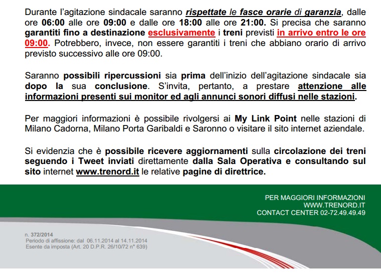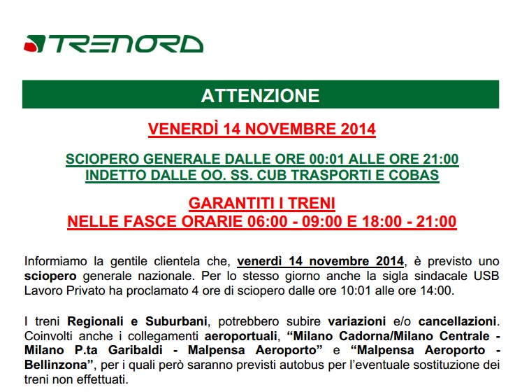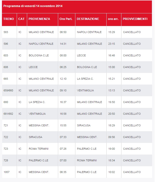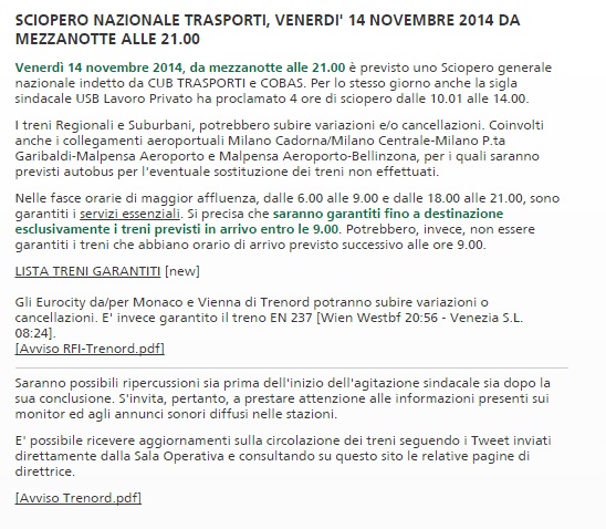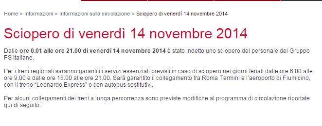 Venerdì 14 novembre lo sciopero treni è indetto per 24 ore. Tuttavia, nelle giornate di sciopero, Trenitalia assicura servizi minimi di trasporto; in quello locale sono stati istituiti i servizi essenziali nelle fasce orarie di maggiore frequentazione (dalle ore 6 alle ore 9 e dalle ore 18 alle ore 21 dei giorni feriali). Sono garantiti, inoltre, alcuni treni a lunga percorrenza, nei giorni feriali e nei festivi. NTV (Italo) ci ha detto che al momento non si prevedono “ripercussioni al regolare servizio dei treni”.