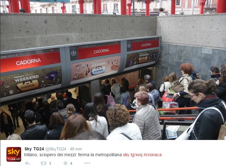 MILANO – Milano nel caos per lo sciopero del Cub contro il piano di lavoro straordinario per l’Expo. Di fatto uno sciopero dei trasporti. A tre giorni dall’inaugurazione della manifestazione internazionale l’adesione all’agitazione indetta dalla Confederazione Unitaria di Base Trasporti (Cub Trasporti) è stata altissima. Dalle 8:45 alle 15 sono pochissime le linee della metropolitana, gli autobus e i tram che hanno deciso di circolare comunque in città. E prima che l’agitazione cominciasse i mezzi pubblici sono stati letteralmente presi d’assalto. Vista la quasi totale assenza di bus e metro anche i taxi sono diventati introvabili: tutti prenotati e già presi.