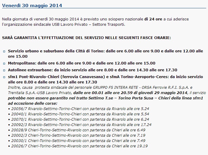 Servizio urbano e suburbano di Torino: dalle ore 6.00 alle ore 9.00 e dalle ore 12.00 alle ore 15.00. Metropolitana: dalle ore 6.00 alle ore 9.00 e dalle ore 12.00 alle ore 15.00. Autolinee extraurbane: da inizio servizio alle ore 8.00 e dalle ore 14.30 alle ore 17.30. sfm1 Pont-Rivarolo-Chieri (ferrovia Canavesana) e sfmA Torino-Aeroporto-Ceres: da inizio servizio alle ore 8.00 e dalle ore 14.30 alle ore 17.30. Sarà assicurato il completamento delle corse in partenza entro il termine delle fasce di servizio garantito.