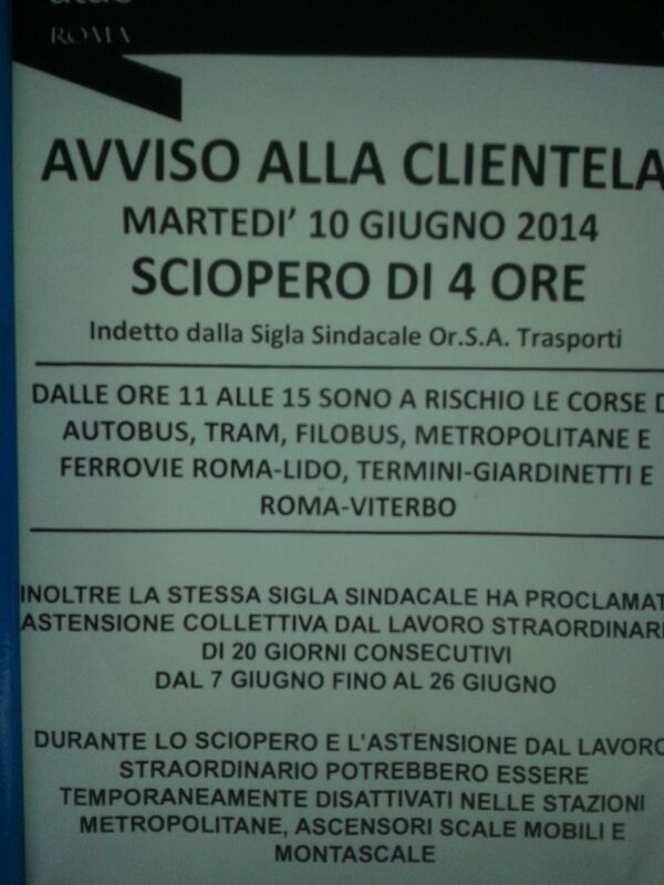 Inoltre la Or.S.A. ha proclamato astensione dal lavoro straordinario di 20 giorni consecutivi dal 7 giugno fino al 26 giugno 2014. Durante lo sciopero potrebbero essere temporaneamente disattivati nelle stazioni metropolitane, ascensori, scale mobili e montascale.