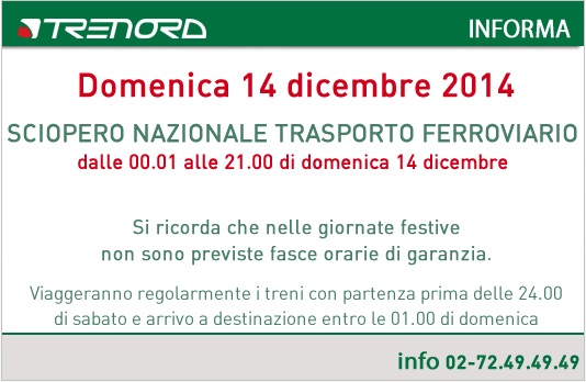 Trenitalia: dalle ore 00.00 alle ore 21.00 di domenica 14 dicembre è stato indetto uno sciopero nazionale del personale del Gruppo FS Italiane. Le Frecce circoleranno regolarmente. Per i treni regionali potranno verificarsi cancellazioni o variazioni. Sarà garantito il collegamento tra Roma Termini e l’aeroporto di Fiumicino con il servizio “Leonardo Express” o con autobus sostitutivi. Per i treni a lunga percorrenza sono previste modifiche al programma di circolazione.