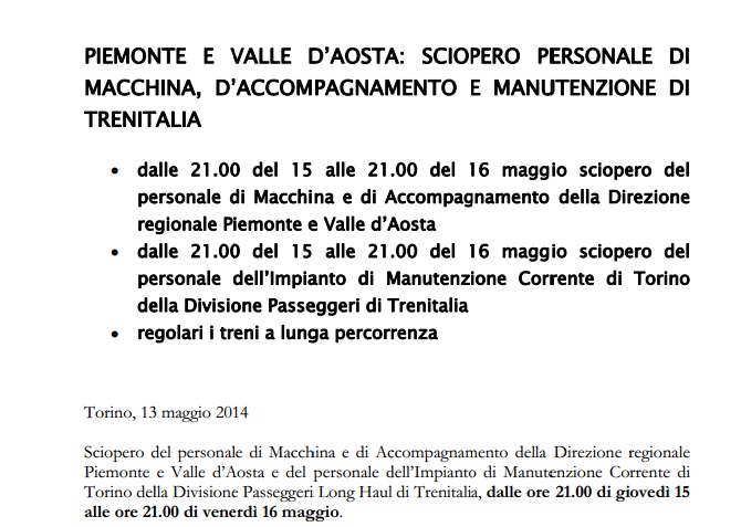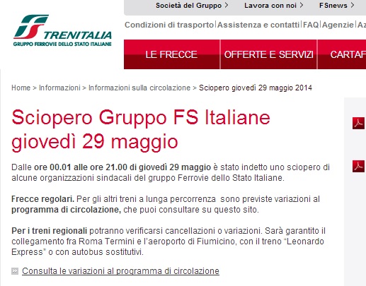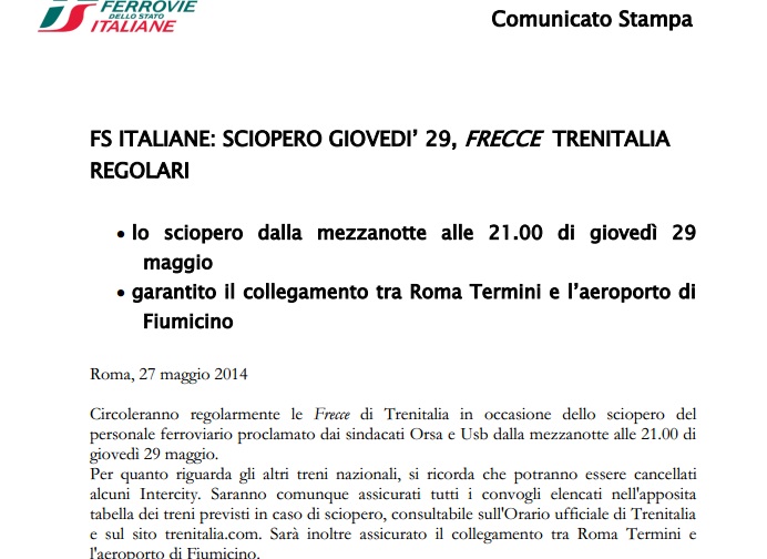ROMA – Giovedì 29 maggio 2014 le organizzazioni sindacali Or.S.A. Ferrovie e Usb Lavoro Privato hanno indetto uno sciopero dei treni della durata di 21 ore, da mezzanotte alle 21.