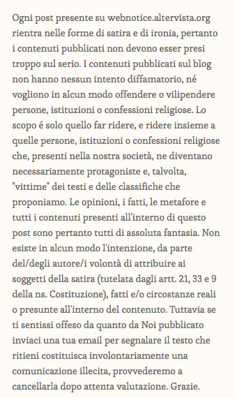 Ogni post presente su webnotice.altervista.org rientra nelle forme di satira e di ironia, pertanto i contenuti pubblicati non devono esser presi troppo sul serio. I contenuti pubblicati sul blog non hanno nessun intento diffamatorio, né vogliono in alcun modo offendere o vilipendere persone, istituzioni o confessioni religiose. Lo scopo é solo quello far ridere, e ridere insieme a quelle persone, istituzioni o confessioni religiose che, presenti nella nostra società, ne diventano necessariamente protagoniste e, talvolta, “vittime” dei testi e delle classifiche che proponiamo. Le opinioni, i fatti, le metafore e tutti i contenuti presenti all’interno di questo post sono pertanto tutti di assoluta fantasia. Non esiste in alcun modo l’intenzione, da parte del/degli autore/i volontà di attribuire ai soggetti della satira (tutelata dagli artt. 21, 33 e 9 della ns. Costituzione), fatti e/o circostanze reali o presunte all’interno del contenuto. Tuttavia se ti sentissi offeso da quanto da Noi pubblicato inviaci una tua email per segnalare il testo che ritieni costituisca involontariamente una comunicazione illecita, provvederemo a cancellarla dopo attenta valutazione. Grazie.