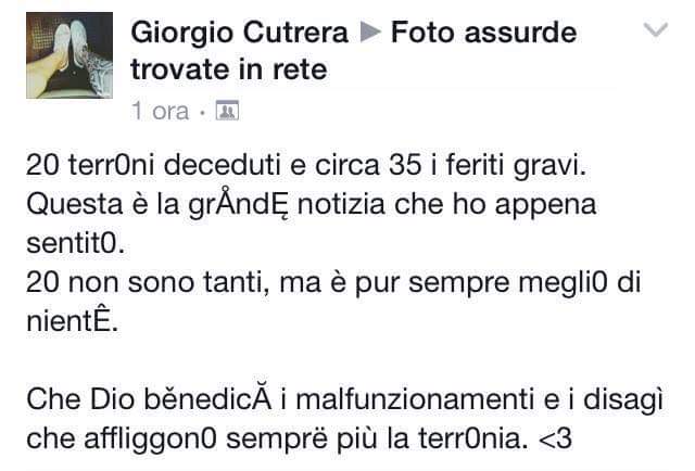 Il testo del post che tal Giorgio Cutrera avrebbe condiviso su Facebook è questo: