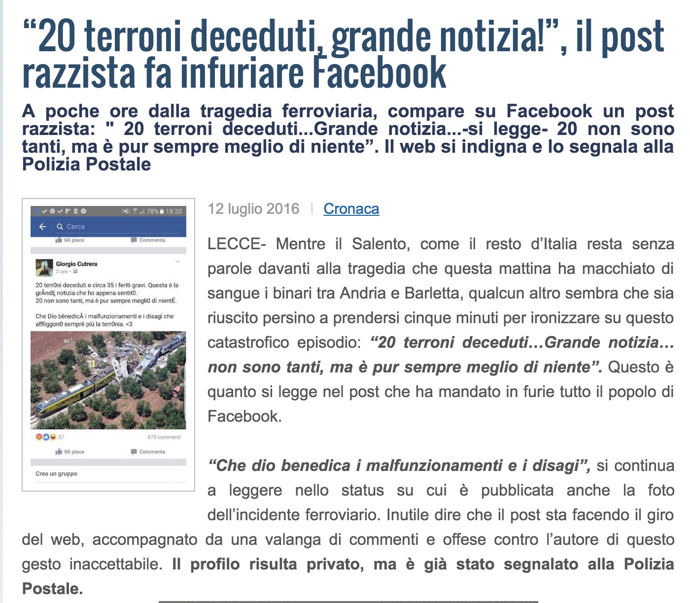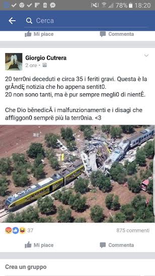 “Un giovane padovano è stato fermato dalla polizia postale mentre tentava ancora una volta di pubblicare sul suo profilo facebook commenti spregevoli sull’incidente ferroviario avvenuto tra Andria e Corato alle ore 11:30 del 12 luglio. Gli agenti sono stati allertati dai centinaia di utenti che sono rimasti sconcertati per i commenti pubblicati su facebook dal giovane padovano e immediatamente è partita la ricerca del giovane che è stato trovato in casa sua intento a smanettare con il proprio computer, rischia l’arresto”.