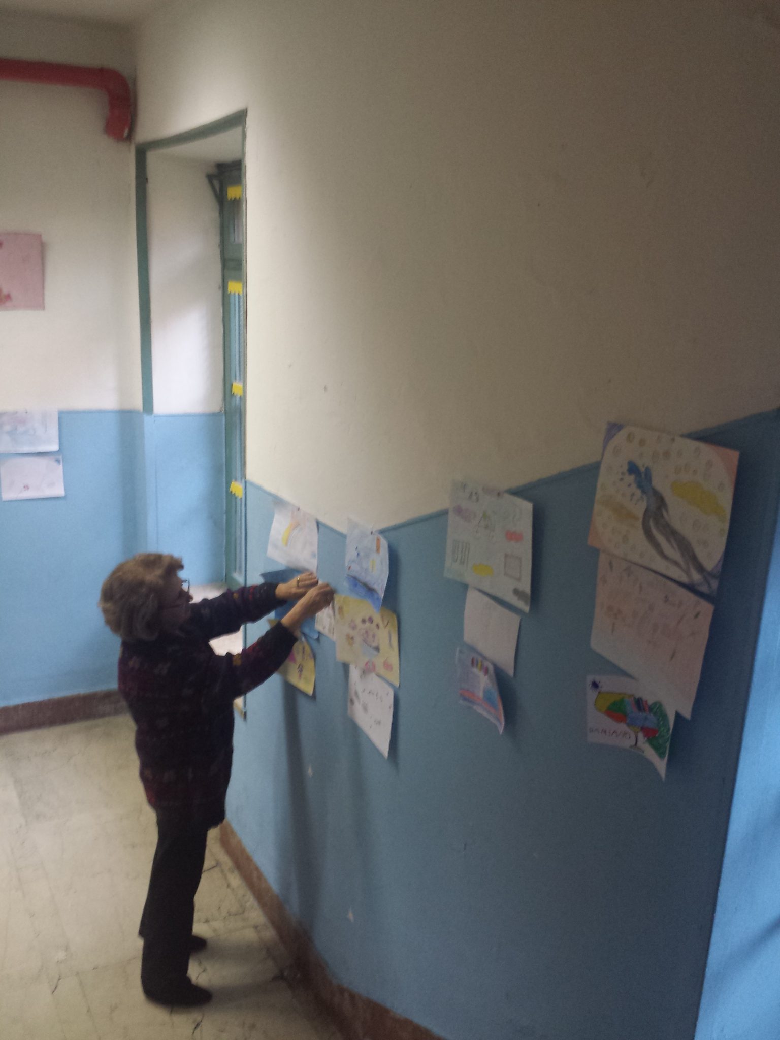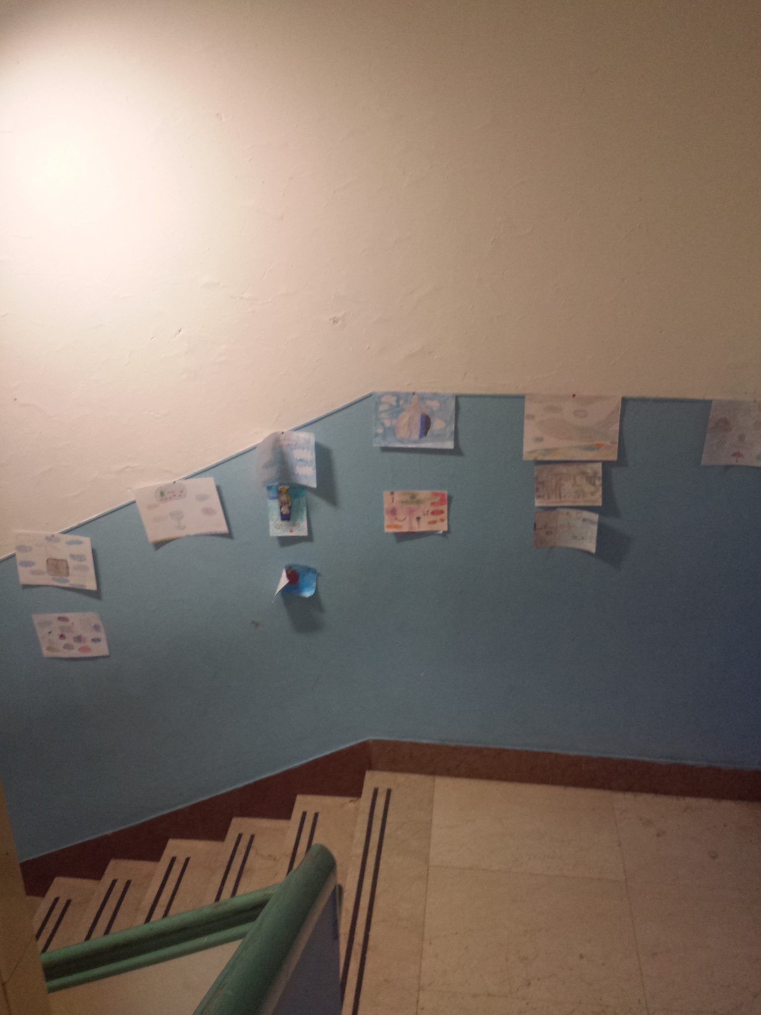 Vito e Sofia, due alunni della quinta B, orgogliosi di essere parte del progetto che ha coinvolto la loro scuola, mostrano entusiasti le pareti cosparse dalle bozze di ciò che potrà diventare un dipinto o un affresco, tra queste indicano i fogli di carta su cui hanno disegnato le loro proposte e ne spiegano il percorso creativo con parole semplici e chiare.