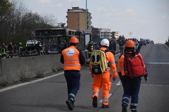 L’uomo usa benzina, cosparge il mezzo di benzina prima di appiccare il fuoco volontariamente. I piccoli scolari sono tutti in salvo, sostanzialmente in salvo. Una dozzina di loro presentano sintomi più o meno lievi di intossicazione, hanno respirato un po’ di fumi dell’incendio. Devono esser riusciti tutti a scendere in fretta e in tempo. Così almeno i primi racconti, sperando siano precisi e completi. Paura, ovviamente paura.