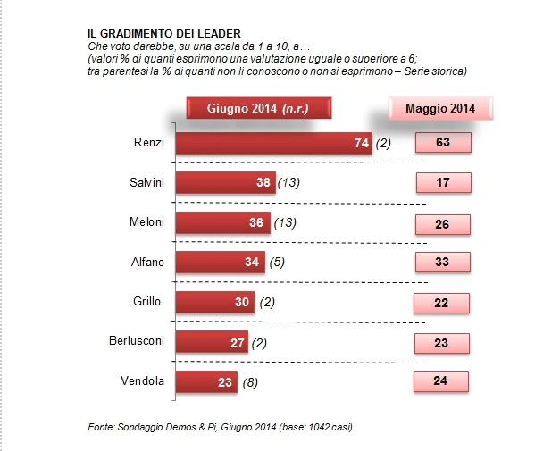 “Il segretario della Lega Nord ottiene, infatti, la fiducia dal 38% degli intervistati. Poco più della metà, rispetto a Renzi. Ma, comunque, oltre il doppio di due mesi fa. La presidente dei Fratelli d’Italia è valutata positivamente dal 36% degli intervistati: 10 punti più rispetto al sondaggio pre-elettorale. Si tratta di dati particolarmente significativi, soprattutto se messi a confronto con l’orientamento verso gli altri principali leader di partito. […] D’altronde, non solo Renzi, per primo e sopra tutti, ma anche Salvini e Meloni si distinguono dagli altri perché sono più “giovani”, per generazione biografica e politica. Il fattore età, evidentemente, non ha mai contato tanto come ora”.