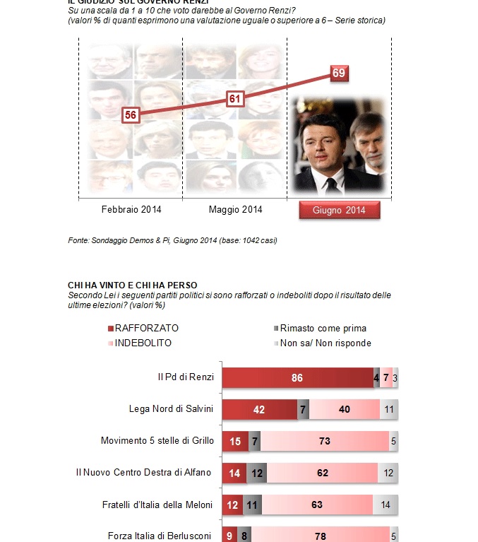 “Un livello di consenso larghissimo. Conquistato, in precedenza, solo da Monti, al momento dell’incarico. Non certo da Berlusconi, neppure nei giorni migliori. Oggi, tra le figure pubbliche, solo Papa Francesco è più popolare di lui. E, come il Papa, Renzi appare popolare presso tutti gli elettorati. Da Sinistra a Destra, passando per il Centro. Perfino fra gli elettori del M5S quasi 6 su 10 esprimono fiducia nei suoi riguardi.