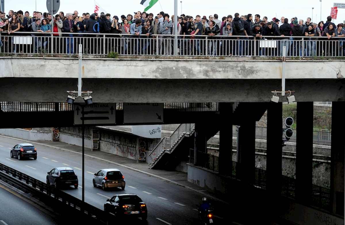 Nella foto Ansa, i manifestanti del corteo selvaggio del 27 ottobre 2012 sulla tangenziale est, Roma, 27 ottobre 2012.
