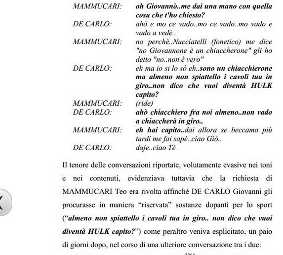 Il tenore delle conversazioni riportate, volutamente evasive nei toni e nei contenuti, evidenziava tuttavia che la richiesta di MAMMUCARI Teo era rivolta affinché DE CARLO Giovanni gli procurasse in maniera “riservata” sostanze dopanti per lo sport (“almeno non spiattello i cavoli tua in giro.. non dico che vuoi diventà HULK capito?”) come peraltro veniva esplicitato, un paio di giorni dopo, nel corso di una ulteriore conversazione tra i due: – Il 27 giugno 2013, alle ore 21,272264, DE CARLO Giovanni chiamava MAMMUCARI Teo sull’utenza nr. 3931208964. Quest’ultimo, diceva di essere appena tornato molto stanco dalla palestra e si lamentava con DE CARLO Giovanni che non era riuscito a procurargli il “GH” 2265, nonostante le assicurazioni. DE CARLO Giovanni replicava che lui era “passato dall’amico mio” ma che questi era partito.