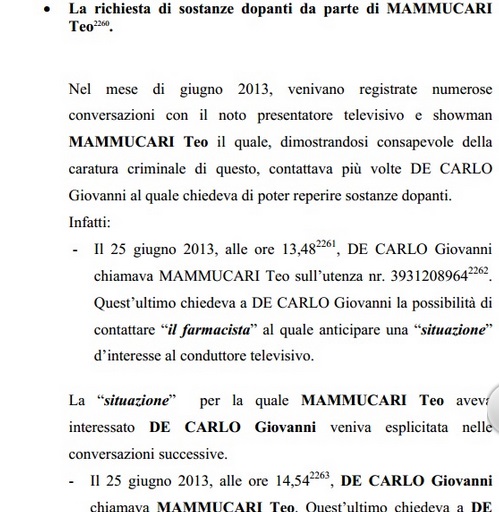 Nel mese di giugno 2013, venivano registrate numerose conversazioni con il noto presentatore televisivo e showman MAMMUCARI Teo il quale, dimostrandosi consapevole della caratura criminale di questo, contattava più volte DE CARLO Giovanni al quale chiedeva di poter reperire sostanze dopanti. Infatti: – Il 25 giugno 2013, alle ore 13,482261, DE CARLO Giovanni chiamava MAMMUCARI Teo sull’utenza nr. 39312089642262. Quest’ultimo chiedeva a DE CARLO Giovanni la possibilità di contattare “il farmacista” al quale anticipare una “situazione” d’interesse al conduttore televisivo. La “situazione” per la quale MAMMUCARI Teo aveva interessato DE CARLO Giovanni veniva esplicitata nelle conversazioni successive. – Il 25 giugno 2013, alle ore 14,542263, DE CARLO Giovanni chiamava MAMMUCARI Teo. Quest’ultimo chiedeva a DE CARLO Giovanni se si fosse adoperato “con quella cosa che t’ho chiesto”.