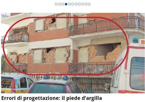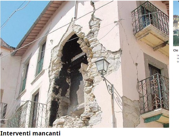 Fai qualche passo verso il centro e trovi una palazzina. La vedi da lontano e pensi che abbia tenuto. E’ un’altra beffa. C’è un piano, in mezzo, completamente sgretolato mentre gli altri piani sono complessivamente in condizioni decenti. La colpa qui è di un errore di progettazione. La casa è in cemento armato e i costruttori non hanno distribuito in modo uniforme il carico di rigidezza. E così il primo piano di affloscia come se avesse i piedi di argilla.