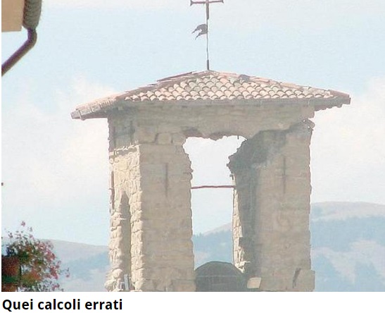 Infine la Chiesa di Sant’Agostino. Anche la Chiesa, apparentemente, ha tenuto. E’ rimasta in piedi, certo: ma ha subito danni pesantissimi, come il crollo parziale del tetto e del campanile. Uno sguardo attento smaschera subito i difetti. Non si tratta di speculazione e di risparmio a scapito della sicurezza ma di errori di calcolo. Le catene antisismiche infatti nella costruzione ci sono e hanno impedito il crollo totale ma chi ha progettato non ha tenuto conto del fatto che le finestre avrebbero causato un piano debole. Da qui il crollo parziale e il tetto praticamente spezzato in due.
