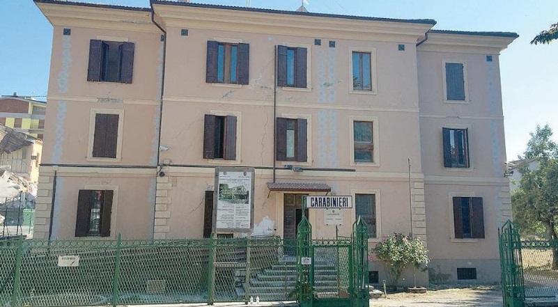 Qualcosa è rimasto in piedi. E’ la caserma dei carabinieri. A vederla in foto sembra che qui il terremoto non ci sia stato. Decisive le catene antisismiche inserite non molto tempo prima del sisma (sono i riquadri scuri sul tetto dell’edificio). Anche la forma squadrata e regolare ha aiutato la tenuta della caserma che è stata comunque evacuata in attesa di ulteriori verifiche.