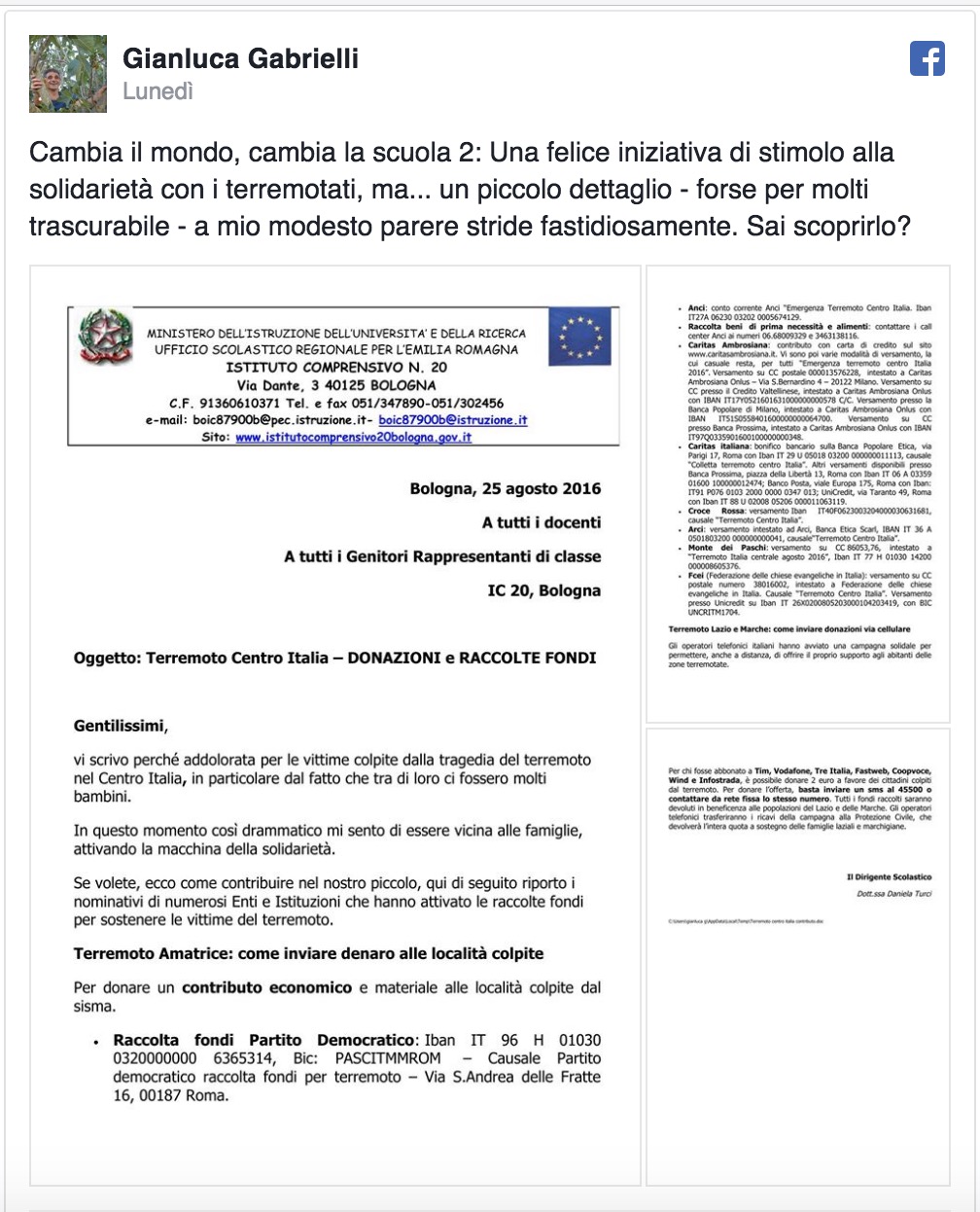 BOLOGNA – Preside invita genitori e alunni a donare soldi per le popolazioni colpite dal terremoto in Centro Italia del 24 agosto. Ma il primo IBAN indicato per le donazioni è quello del Pd, che precede persino quello della Croce Rossa.