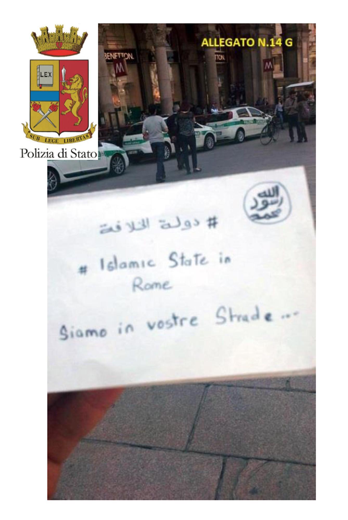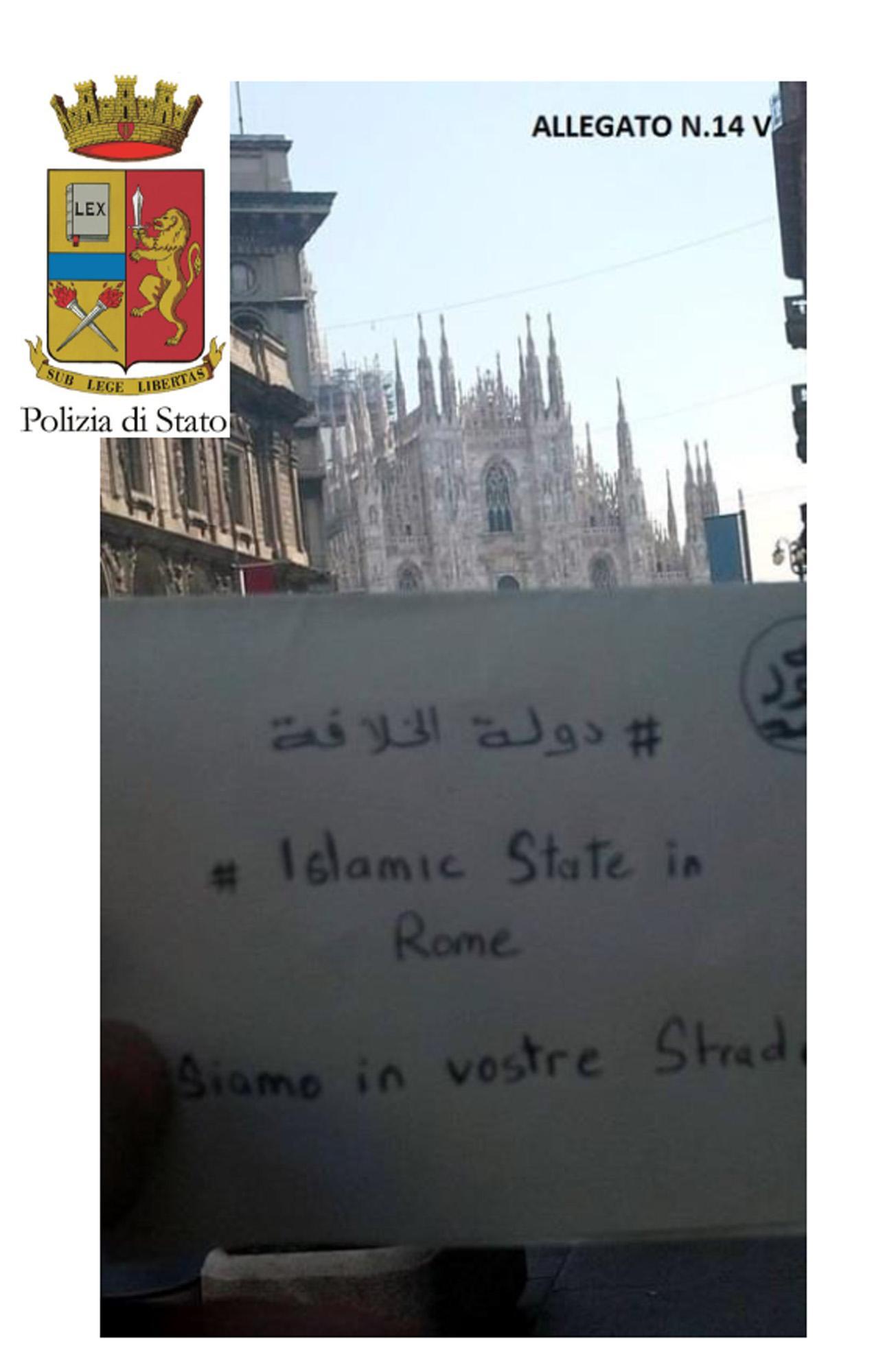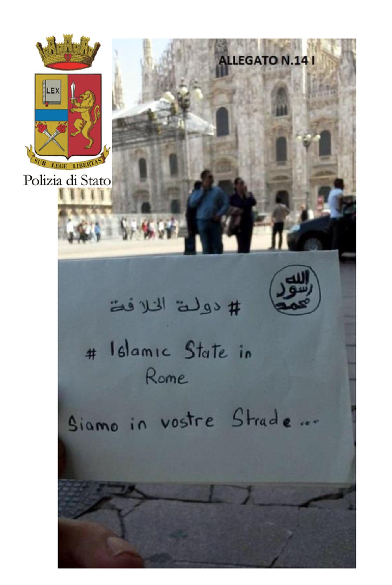 I messaggi. “Siamo nelle vostre strade. Siamo ovunque. Stiamo localizzando gli obiettivi, in attesa dell’ora X”. Questi alcuni dei messaggi, scritti a penna, in italiano, arabo e francese, su dei foglietti tenuti in mano e, sullo sfondo, alcuni luoghi simbolo come il Colosseo, il Duomo o la stazione di Milano. Immortalati anche mezzi della Polizia di Stato e della Polizia locale, fermate della metropolitana, tratti autostradali e bandiere dell’Expo.