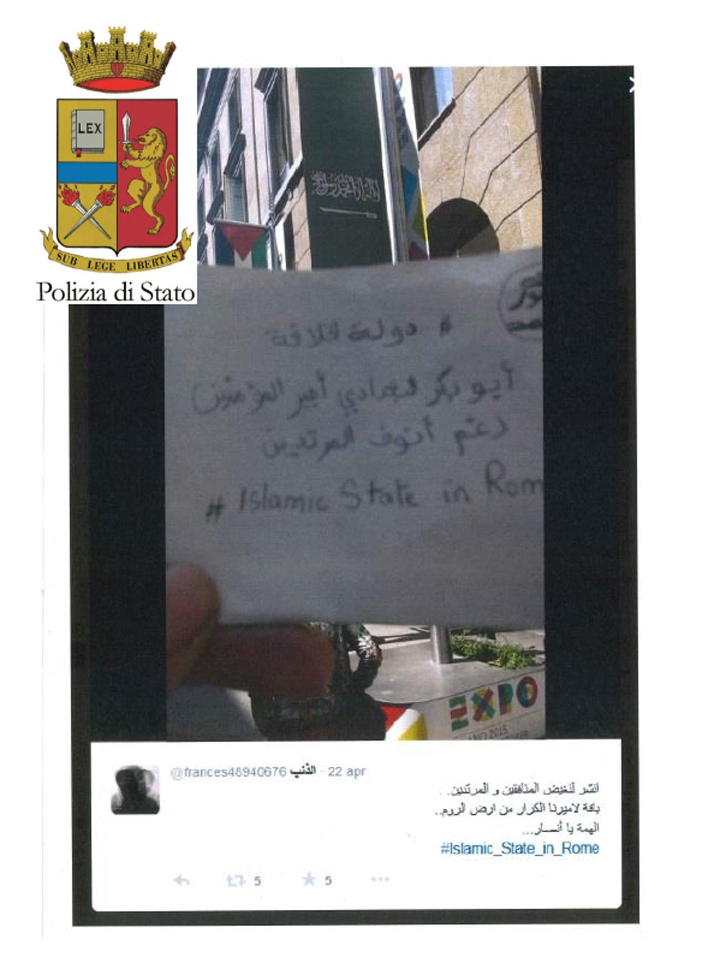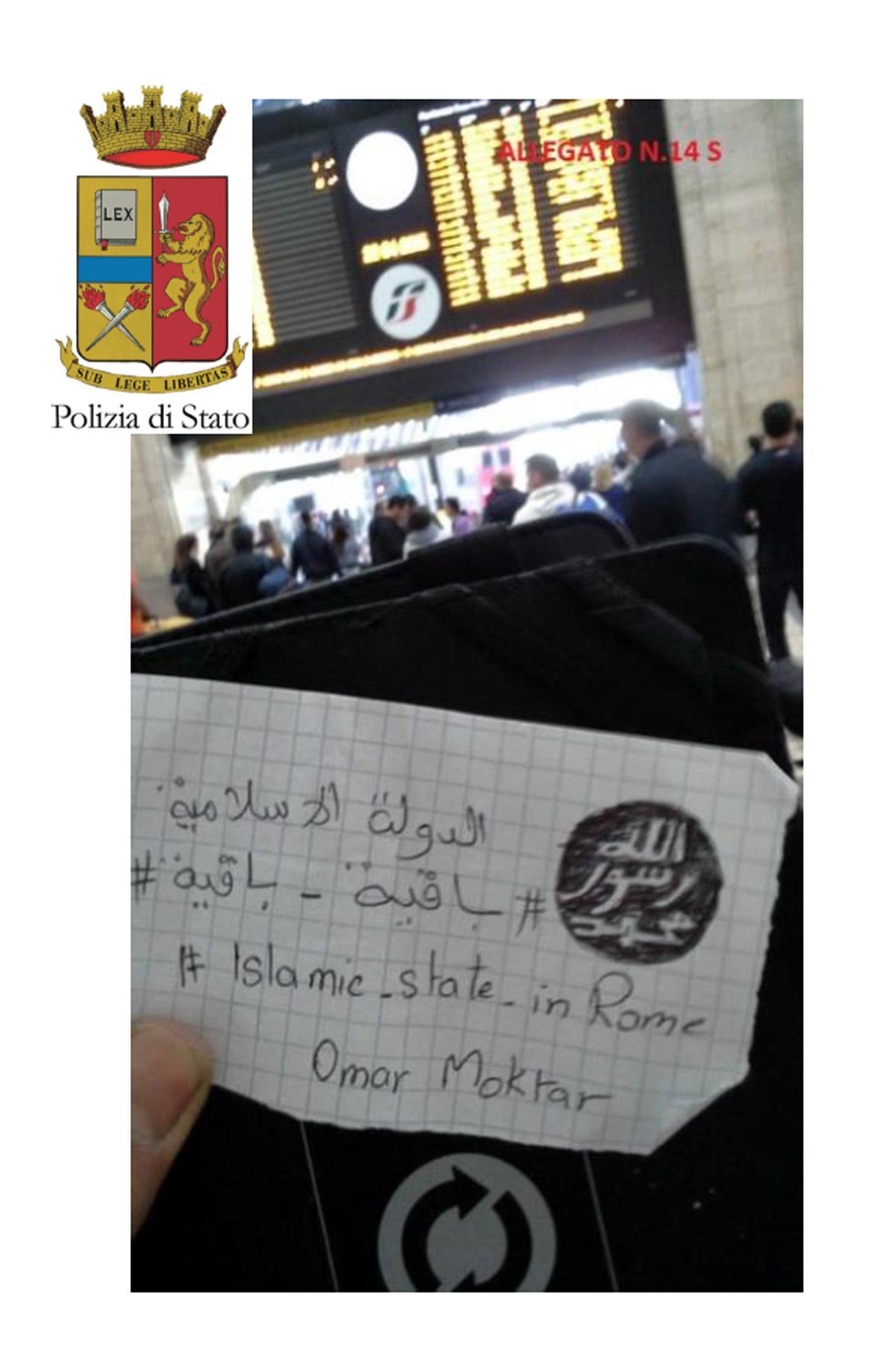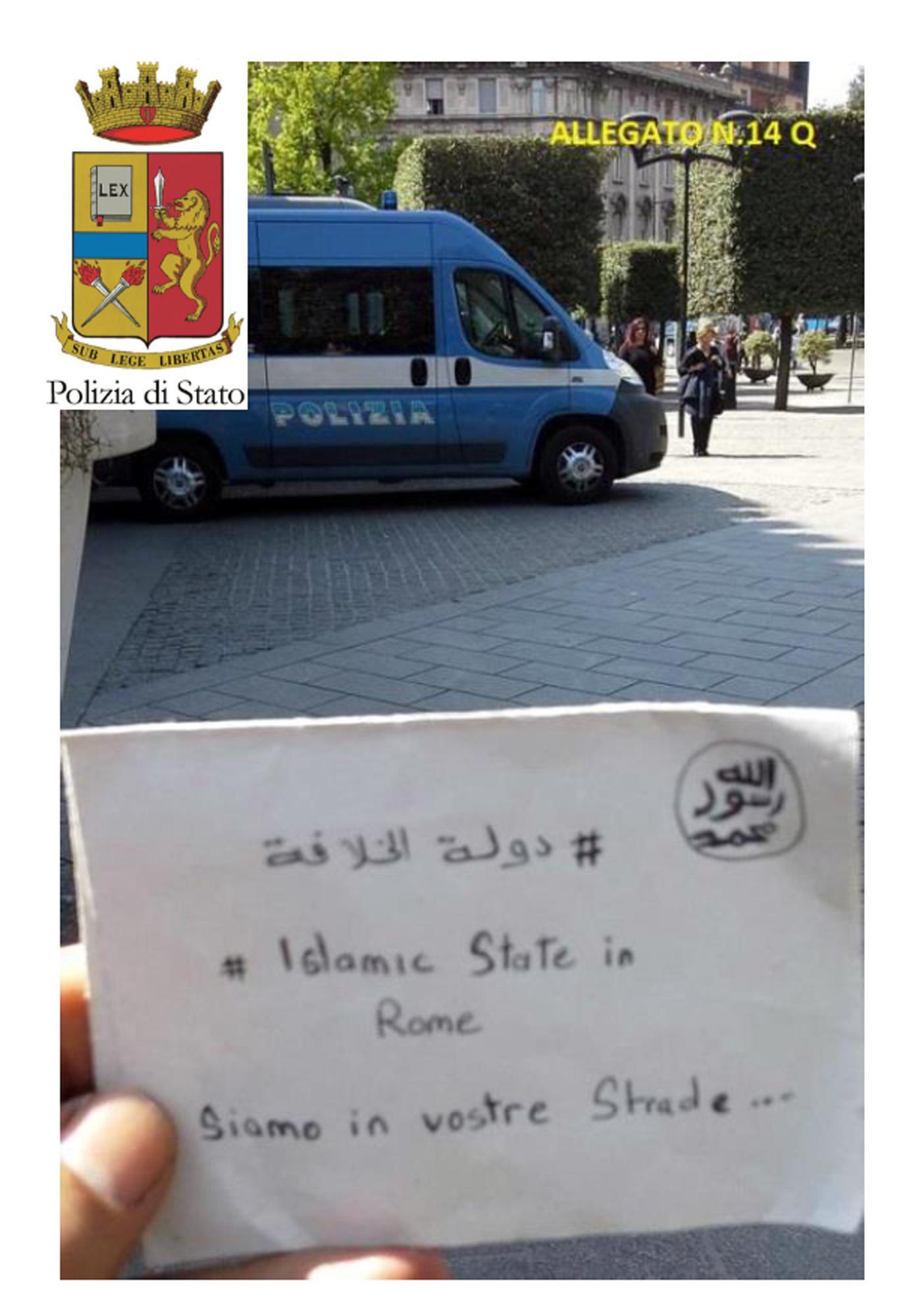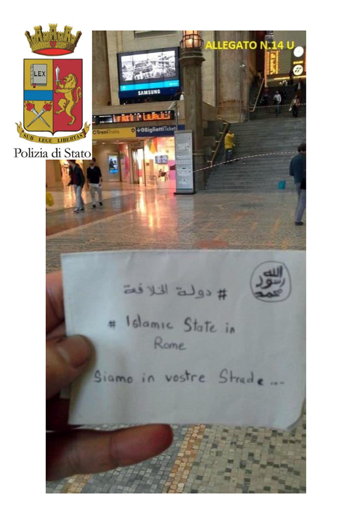 I messaggi. “Siamo nelle vostre strade. Siamo ovunque. Stiamo localizzando gli obiettivi, in attesa dell’ora X”. Questi alcuni dei messaggi, scritti a penna, in italiano, arabo e francese, su dei foglietti tenuti in mano e, sullo sfondo, alcuni luoghi simbolo come il Colosseo, il Duomo o la stazione di Milano. Immortalati anche mezzi della Polizia di Stato e della Polizia locale, fermate della metropolitana, tratti autostradali e bandiere dell’Expo.