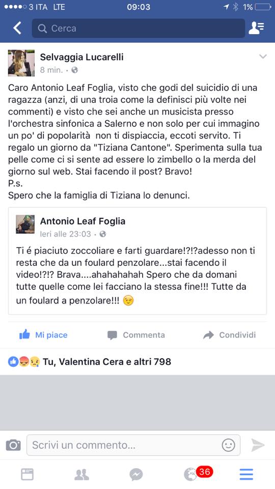 Era il 13 settembre scorso, pochi giorni dopo la morte di Tiziana, quando il musicista scrisse su Facebook parole durissime nei confronti della donna, che lui neppure conosceva. “Ti è piaciuto zoccoliare e farti guardare!?!? Adesso non ti resta che da un foulard penzolare… Stai facendo il video? Brava… Ahahaha Spero che da domani tutte quelle come lei facciano la stessa fine!!! Tutte da un foulard a penzolare!!!”, aveva scritto Foglia su Facebook.